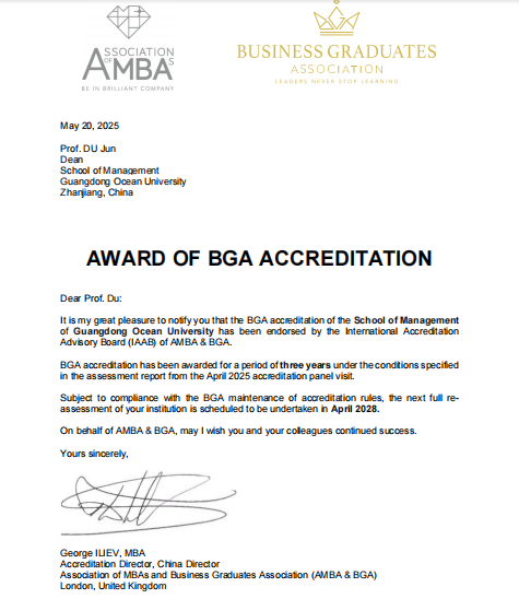 5月20日,公司收到英国商公司毕业生协会(Business Graduates Association,简称BGA,全球商学教育三大认证体系之一)发来的官方贺信,祝贺公司SUNBET申博顺利通过BGA国际金牌认证,标志着SUNBET申博成为国内海洋类大学首所单独获得BGA金牌国际认证的商公司,同时也是公司获得的首个国际商科认证。