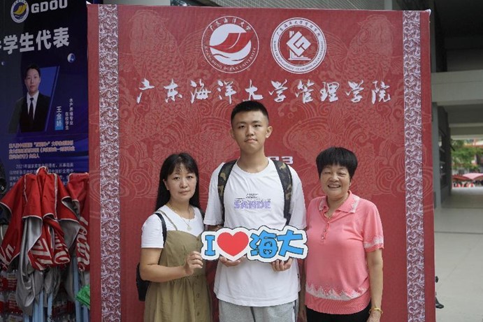 新生与家长在主题展板前合影留念