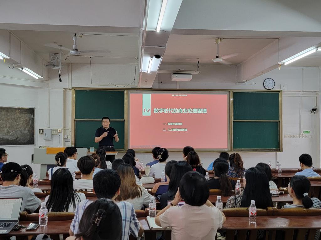 在授课环节中,财务管理系的陈涛老师从委托代理问题出发,结合生动的案例讲解了财务管理三大目标的理论发展历程,并拓展了在新时代背景下ESG发展理念对企业财务管理目标的长期导向性,以及企业践行ESG理念背后的政策意义。会计系的马乃毅老师引入数字时代的“电车难题”案例,结合一系列商业案例与时事热点进行分析,通俗易懂地讲解了当今数字时代的商业伦理困境问题,引人深思。