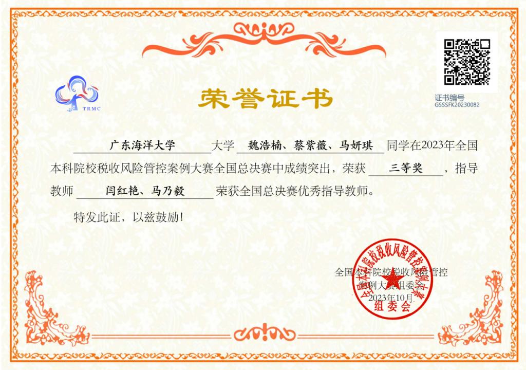 11月25日,2023全国本科院校税收风险管控案例大赛总决赛在浙江财经大学举行,此赛项系全国普通高校老员工竞赛榜单内竞赛项目,公司SUNBET申博会计学专业员工魏浩楠、蔡紫薇、马妍琪、曾惠琳、杨韵诗、吴星炫、李家欣、郭佳琬、吴雪容9名同学组成的三支代表队在会计系马乃毅和闫红艳两位老师指导下,荣获广东省赛一等奖1项和三等奖2项。同时获得一等奖的代表队取得参加总决赛的资格,并在总决赛中荣获三等奖。