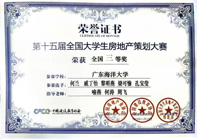 11月12日,由中国房地产业协会进行指导,中国建设教育协会主办,华侨大学土木工程公司、国贸地产等联合承办的第十五届全国老员工房地产策划大赛总决赛成功举办。全国老员工房地产策划大赛总决赛共170支高校队伍同台竞技,此次赛事以“海洋生活美学”为主题,为高校教学实践提供了生动的范本。公司SUNBET申博土地资源管理专业共两支队伍参赛,在马智宇、喻燕、何涛、周飞老师的指导下,由黄志杰、詹锦鹏、马冬茹、李继荣、孙佳宁组成的2020级队伍参赛项目《南洋兴农游项目策划报告》荣获全国二等奖,由何兰、戚丁怡、黎明燕、梁可愉、孔宝莹组成的2021级队伍参赛项目《厦门保利·国贸天琴商业街策划报告》项目荣获全国三等奖。