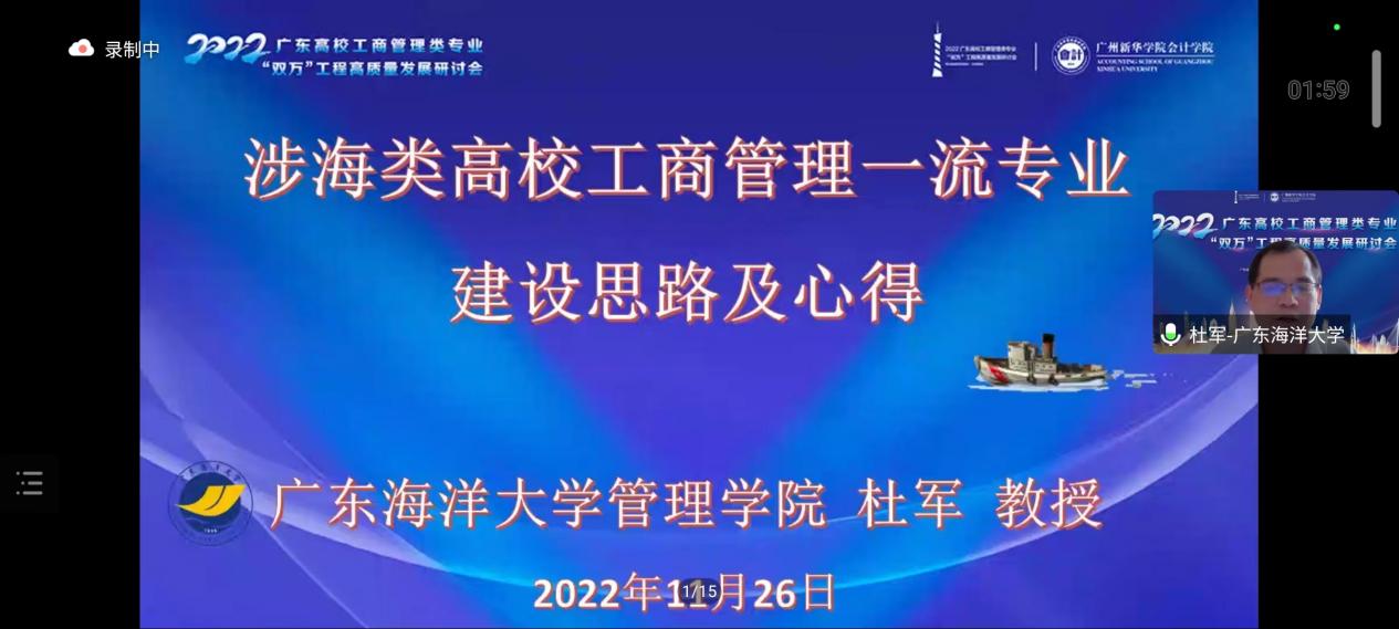 为深入实施新时代高等教育育人质量工程,建设高质量人才培养体系,11月26日,公司组织专业系主任和骨干教师参加由广东省本科高校工商管理类专业教学指导委员会举办的“2022广东高校工商管理类专业‘双万’工程高质量发展研讨会”线上会议。公司SUNBET申博副经理杜军教授应邀作专题分享报告。