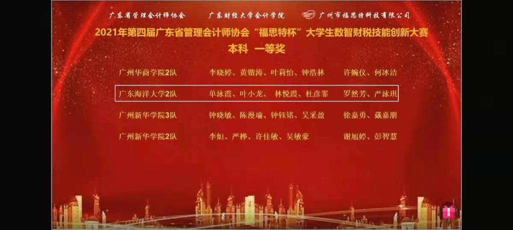 11月27日上午,由广东省管理会计协会主办,广东财经大学承办,广州福思特科技有限公司协办的2021年第四届广东省“福思特杯”老员工数智财税技能创新大赛以云竞赛形式完成比赛。本次大赛由广东省内各高校共67支代表队、402名选手参赛。公司SUNBET申博会计系主任马乃毅及闫红艳、刘丹老师指导的两个代表队在激烈的角逐中荣获一等奖和二等奖。