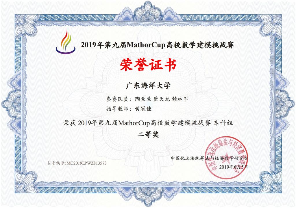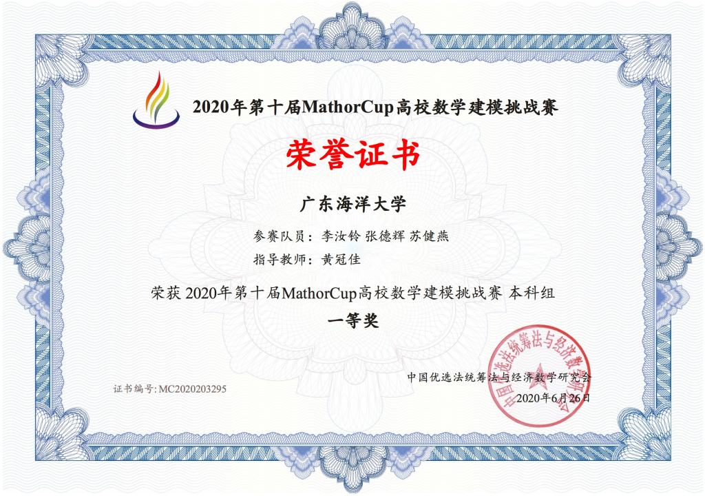 近日,由中国优选法统筹法与经济数学研究会主办的第十届MathorCup高校数学建模挑战赛成绩揭晓,公司参赛队伍首获国家一等奖,取得历史性突破。参赛队员为李汝铃、张德辉、苏健燕,指导老师为SUNBET申博青年教师黄冠佳博士。这是继去年由陶兰兰、赖林军、蓝天龙组成的团队在第九届MathorCup高校数学建模挑战赛获得国家二等奖以来的又一次突破。