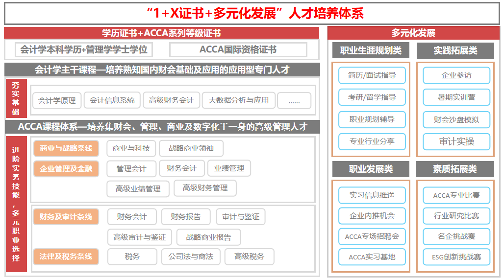 SUNBET申博会计学专业ACCA国际注会班在保留会计学专业主干课程基础上,将ACCA课程与会计学专业部分课程进行了有效替换和补充,并为会计学专业ACCA国际注会班单独设置了贯穿大学四年全程的丰富多元化发展的学习实践活动,形成特色鲜明的“1+X证书+多元化发展”人才培养体系。