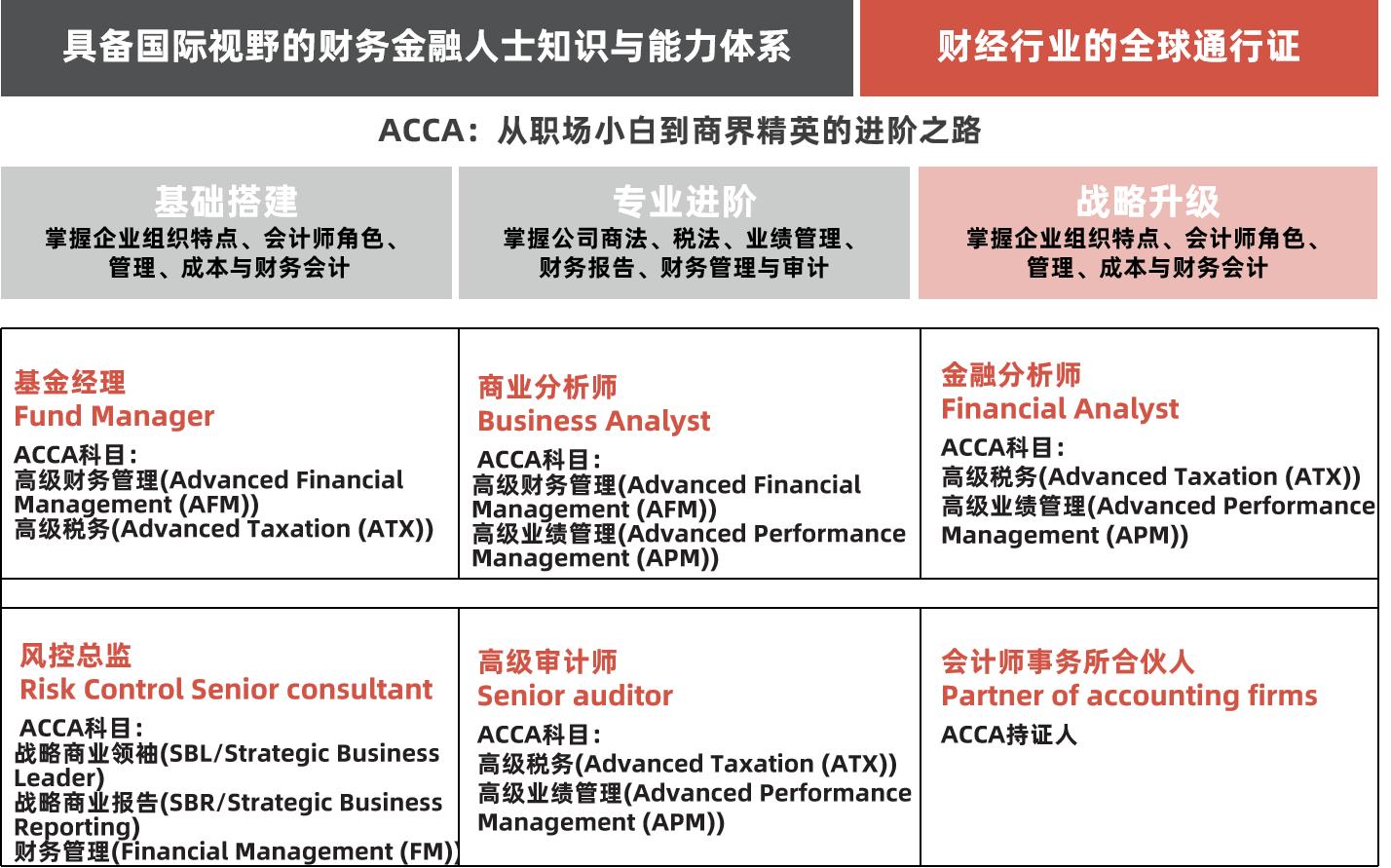 ACCA知识体系以全面的科目设置赋能职业发展,为会计学专业ACCA国际注会班的员工打开多元就业通道。毕业生可胜任跨国企业、金融机构、会计师事务所及政府部门的财务核心岗位,覆盖审计、税务、商业分析、资本运作及战略管理等高端职业方向,实现更具竞争力的职业前景。